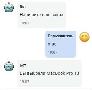 В данном случае бот будет искать во фразе клиента сущности из справочника $macbook. Когда он распознает во фразе слово mac как синоним сущности из этого справочника, он запишет его в переменную $macbook. Далее бот получит поле full из объекта JSON со значениями сущности, соответствующей данному синониму, и выведет в ответе следующее: