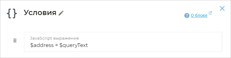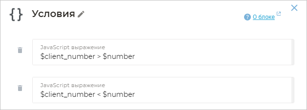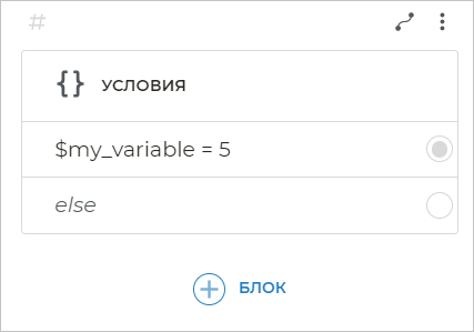 Чтобы создать переменную, добавьте блок Условия и укажите нужное JavaScript-выражение. Например, вы можете присвоить число, строку или значение другой переменной.