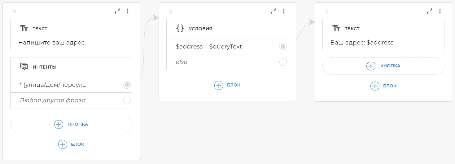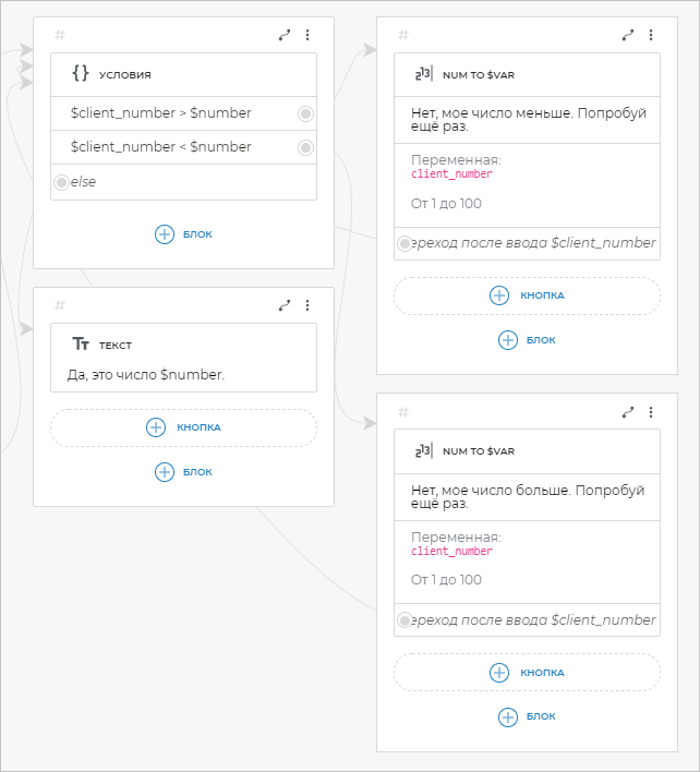 Вы можете использовать переменные в блоке Условия, чтобы бот менял ход диалога в зависимости от выполнения тех или иных условий.