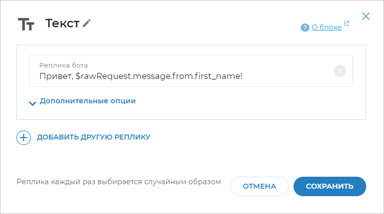 "text": "Имя клиента: $rawRequest.message.from.first_name"