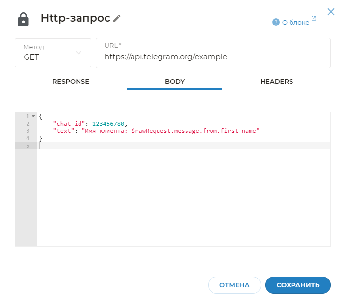Так может выглядеть HTTP-запрос для отправки имени клиента вам в Telegram: