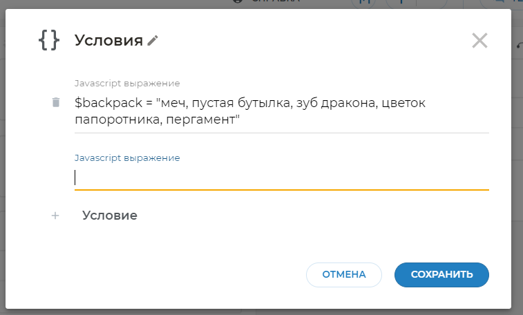 Добавим на него блок Условия. Скопируйте и вставьте в блок Условия следующее: