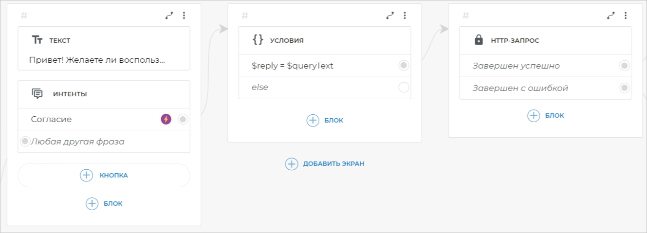 В блоке Условия вы можете использовать любые JavaScript-выражения. В JavaScript знак равенства используется для присвоения, поэтому мы в этом случае не уравниваем содержание этих переменных, а превращаем содержание системной переменной $queryText в содержание переменной $reply.