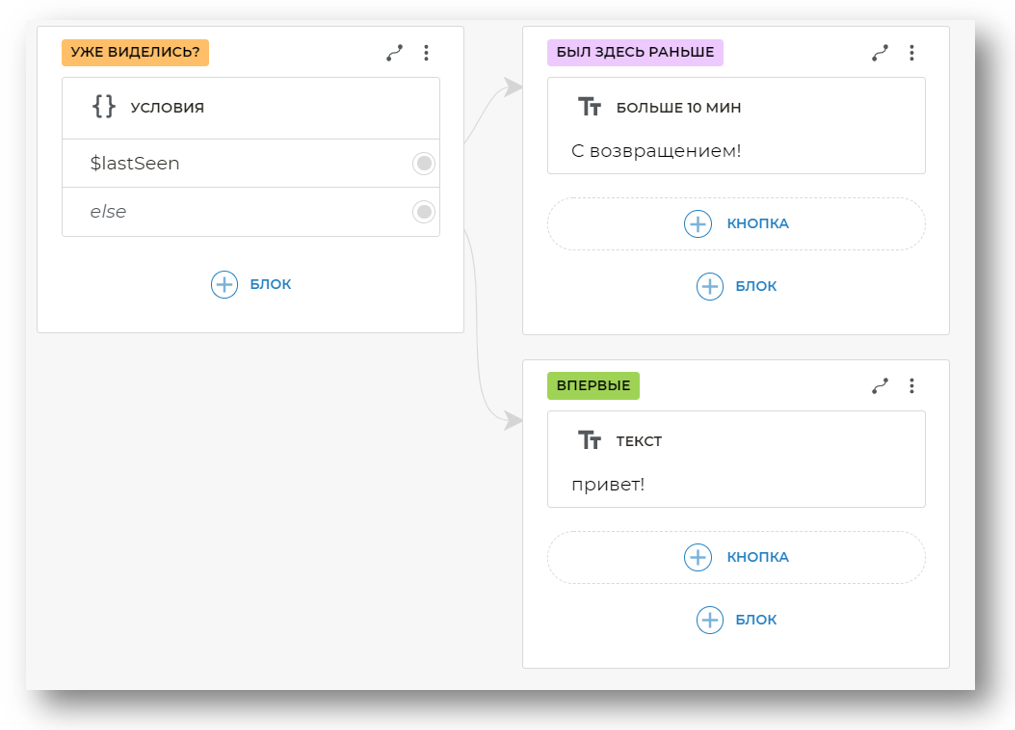 Здесь 600 — это 600 секунд, то есть, 10 минут. Бот будет выдавать реплику «С возвращением!», если пользователь обращался более 10 минут назад, во всех остальных случаях — «Привет!».