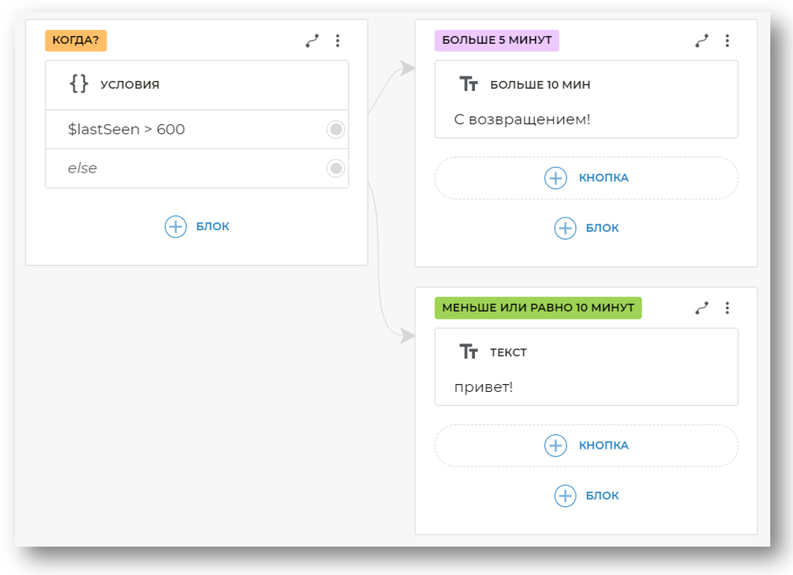 Также вы можете задать временной интервал последнего обращения. Значение может быть задано в блоке Условия с помощью $lastSeen > 600.