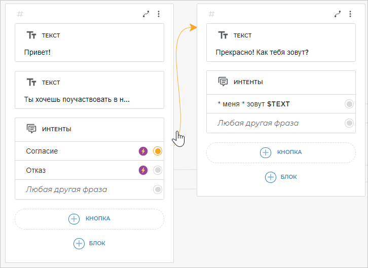 Блоки связываются с экранами с помощью стрелок. Если у блока есть выход, то его можно соединить с другим экраном в сценарии. Бот последовательно выполнит действия сначала одного блока, а потом другого.