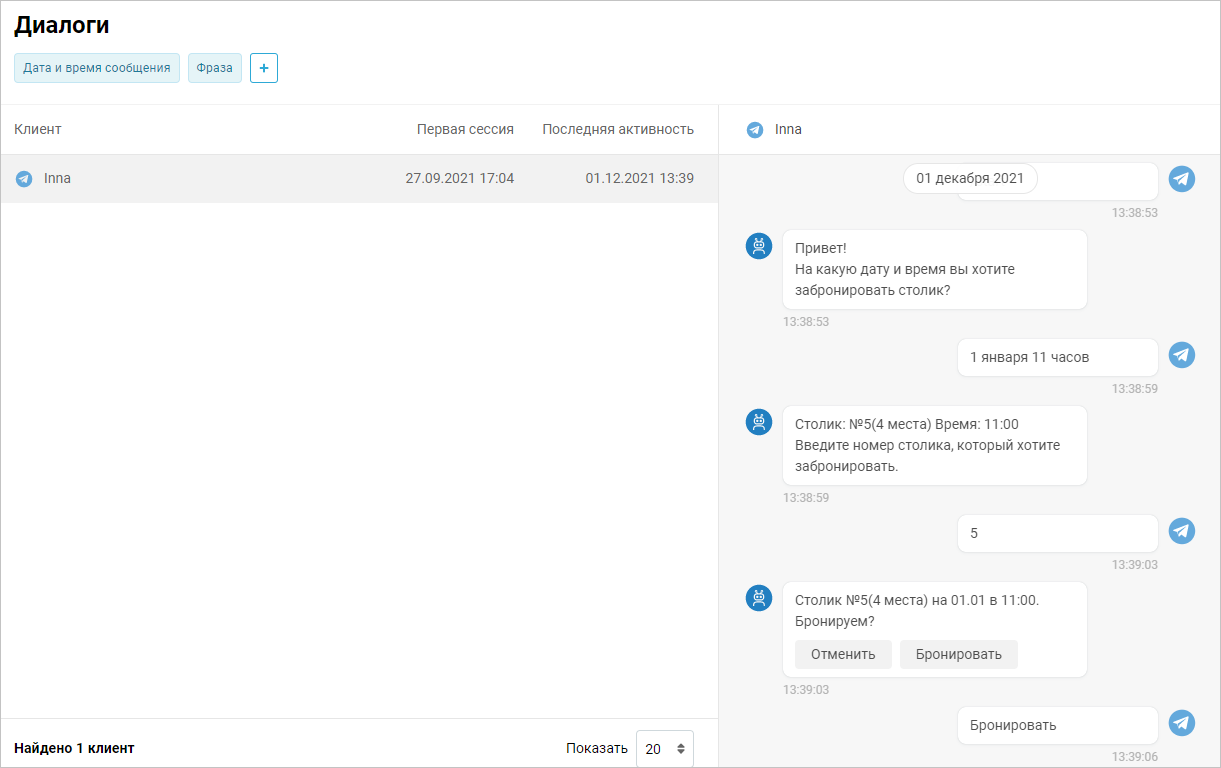 В правой части страницы отображаются все сообщения бота с выбранным клиентом.