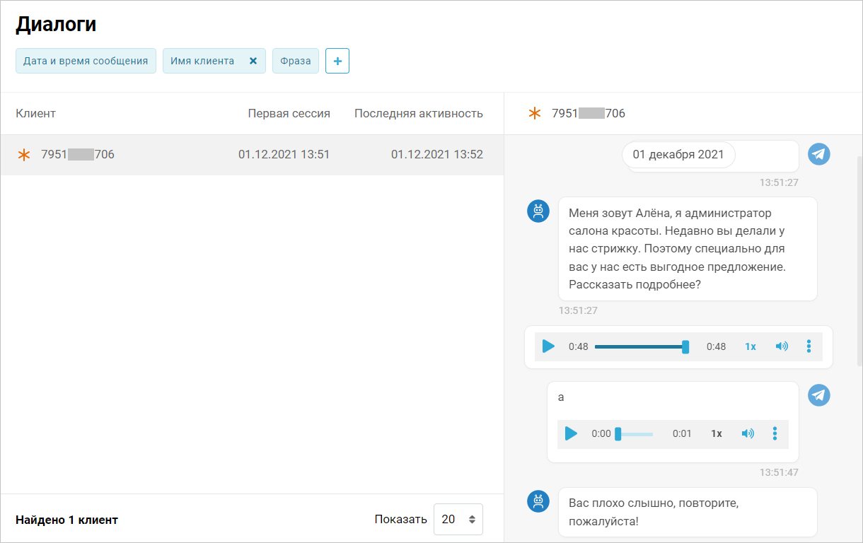 В сценариях для звонков на вкладке Диалоги слева отображается список клиентов, с которыми разговаривал бот. Для каждого клиента отображается: