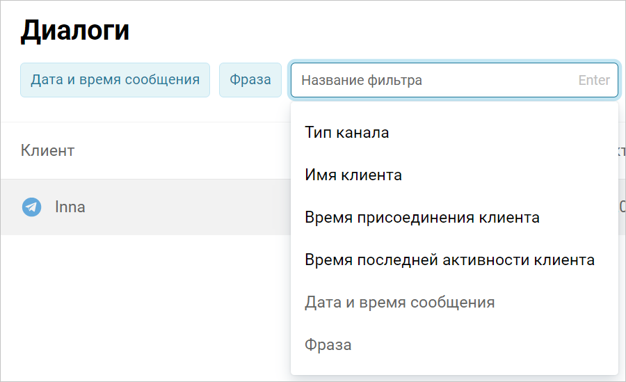 Вы можете отобразить диалоги с теми клиентами, чье последнее сообщение боту было отправлено в указанный период. Для телефонных сценариев здесь будет указана дата и время завершения последнего звонка.