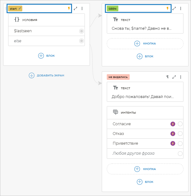 Если переменная $lastSeen не пустая, то бот перейдет на второй экран, на котором тоже будет вызван вебхук и получена переменная $name.