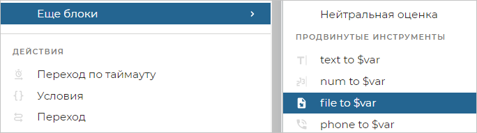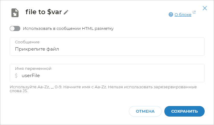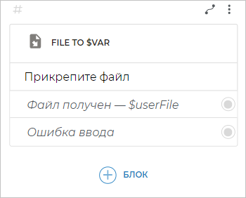 Блок file to $var позволяет боту получить от клиента любой файл, например, фотографию полученного товара, текстовый файл с данными юридического лица и т. п.