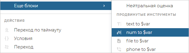 Блок num to $var позволяет боту получить от клиента целое число и сохранить его в переменную.