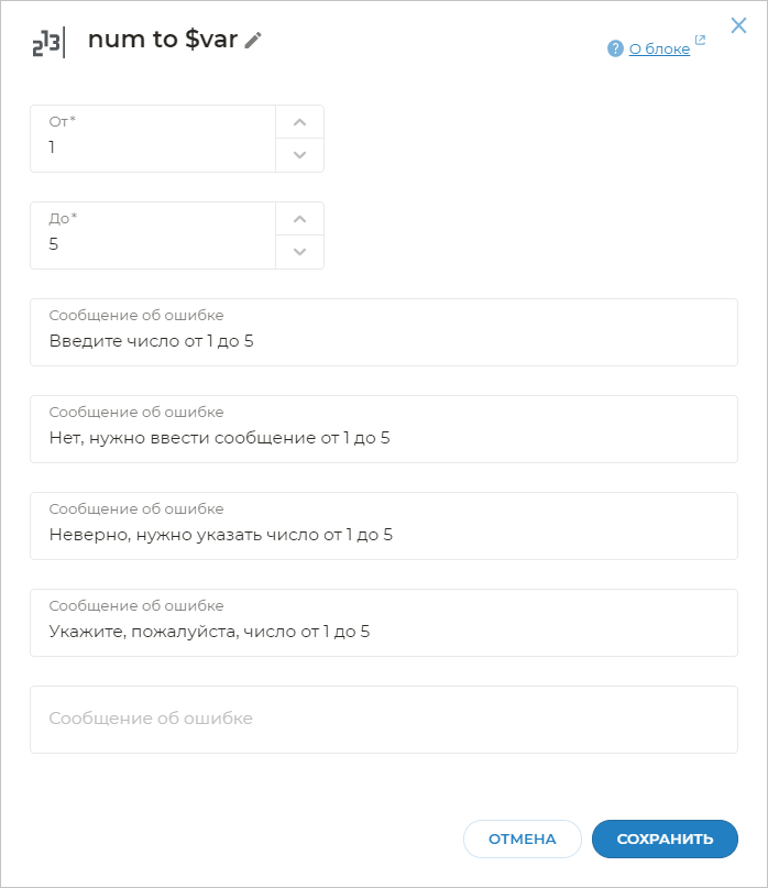 Блок num to $var ожидает от клиента именно число, даже если оно вводится словами, а не цифрами. Блок будет принимать «5», «пять» и такие варианты, как «наверное, 5».