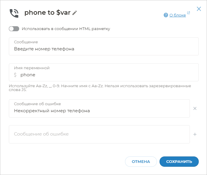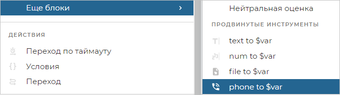 Блок phone to $var позволяет боту получить от клиента номер телефона и сохранить его в переменную. Полученное значение переменной можно использовать на других экранах сценария.