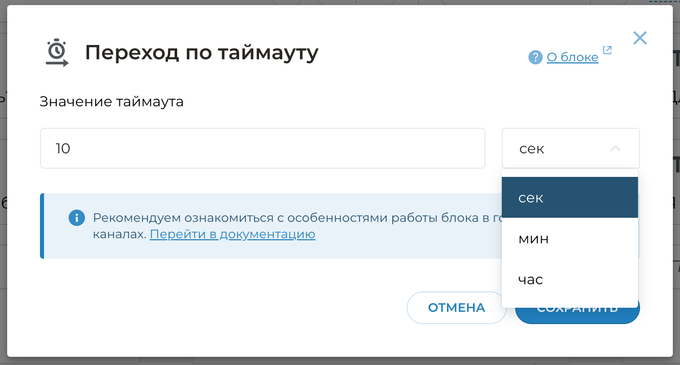 При добавлении блока Таймаут появится всплывающее окно для ввода значения таймаута. Введите его в виде переменной или конкретного временного интервала. Вы можете указать временной интервал в секундах, минутах, или часах.