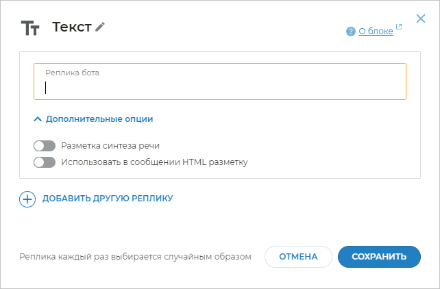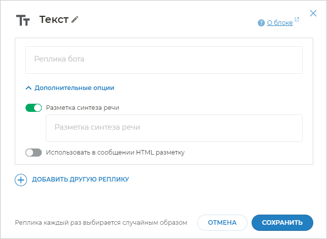 Если нажать на кнопку Добавить другую реплику, то можно указать другой вариант реплики бота. В процессе диалога с клиентом бот будет случайным образом выбирать одну из реплик в этом блоке и выводить ее клиенту.