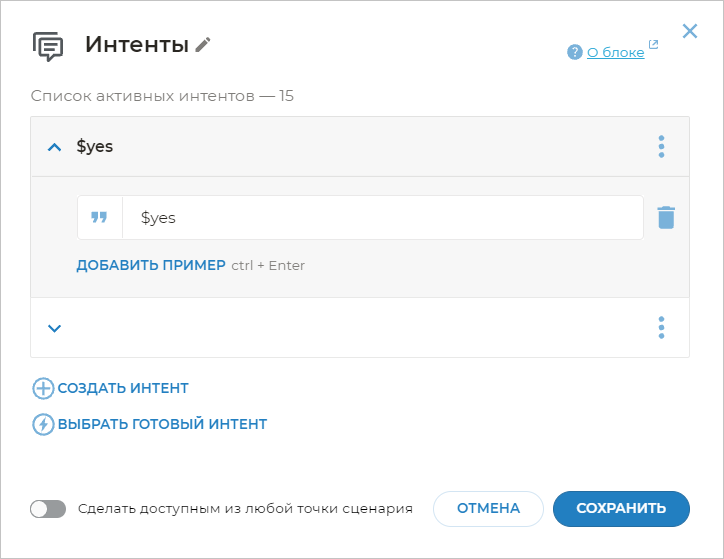 Такой интент будет распознавать фразы клиента, подходящие под шаблон из паттерна $yes.