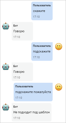 Этот шаблон, состоящий только из одного слова, позволяет боту реагировать только на точную фразу «привет». Если фраза будет отличаться хотя бы на один символ, она не будет распознана ботом.