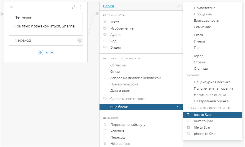 Если вам нужно получить от клиента ответ на какой-либо дополнительный вопрос — выяснить, какая услуга его интересует, на какой адрес доставить товар, какое время удобно для звонка и т. п. — вы можете получить эту информацию с помощью еще одного блока text to $var.