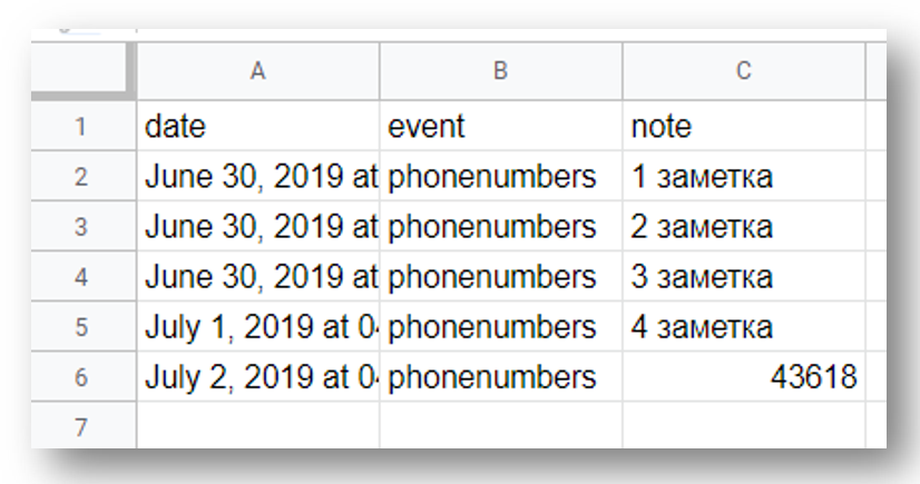 На этом этапе в вашей Google Таблице уже должны быть записи, которые вы сделали с помощью бота в процессе тестирования записи. В первой строчке таблицы поместите названия столбцов. Например, назовем столбцы так: date — дата, которую IFTTT прописывает автоматически event — название вашего события IFTTT (вы можете в одну таблицу делать запись с помощью разных событий, и названия событий могут говорить вам о содержании или значении заметок) note — сам текст заметки.