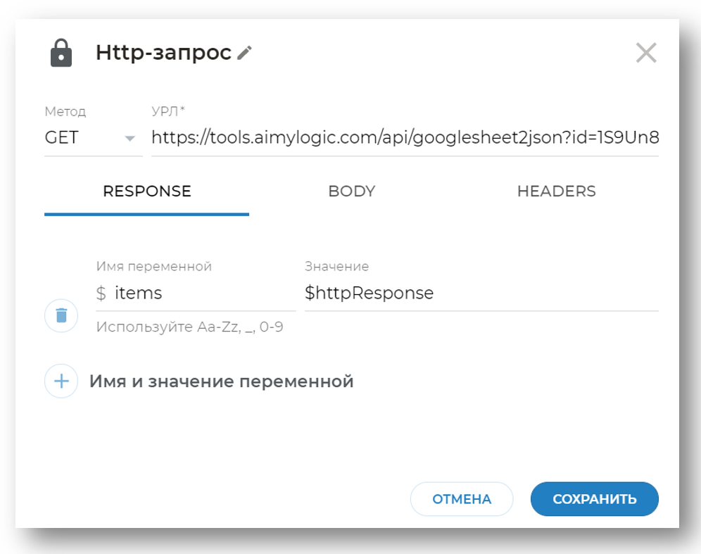 RESPONSEназовите переменнуюitemsи запишите значение$httpResponse - Вкладки