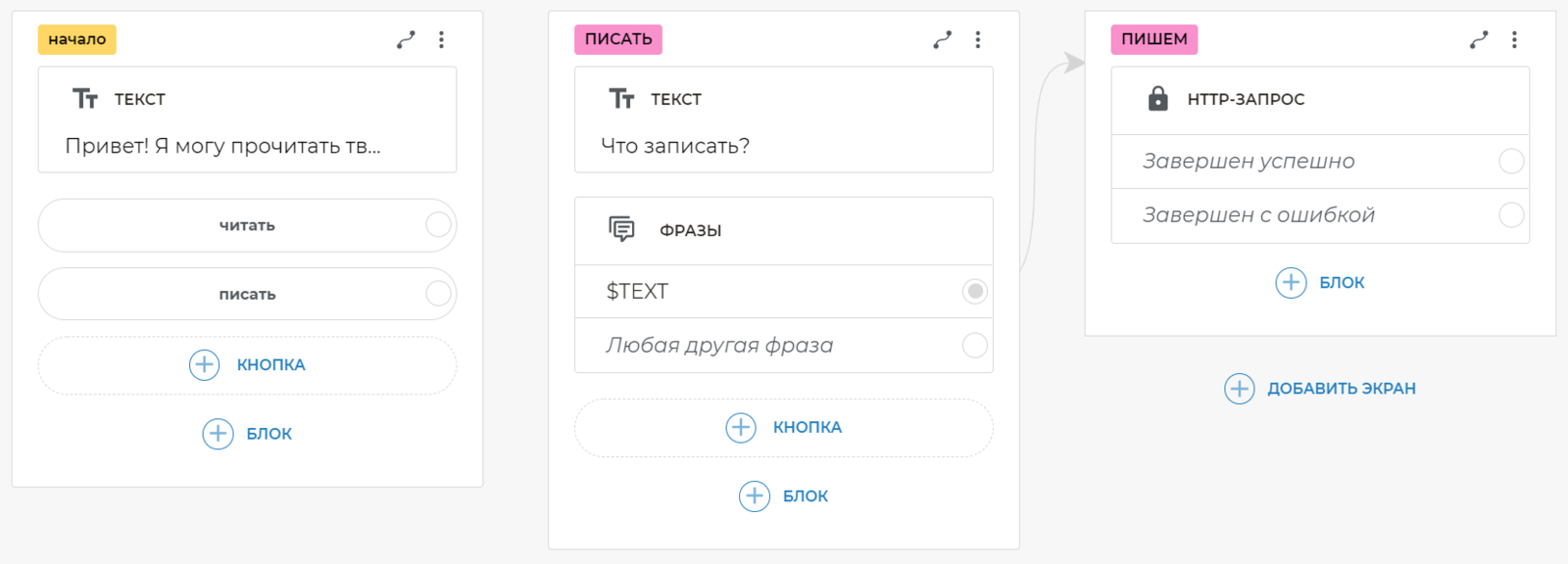 От варианта Завершен успешно Http-запроса протяните связь и создайте текстовый блок, на котором разместите сообщение об успешной записи: Записал. Будем читать или записать еще одну?