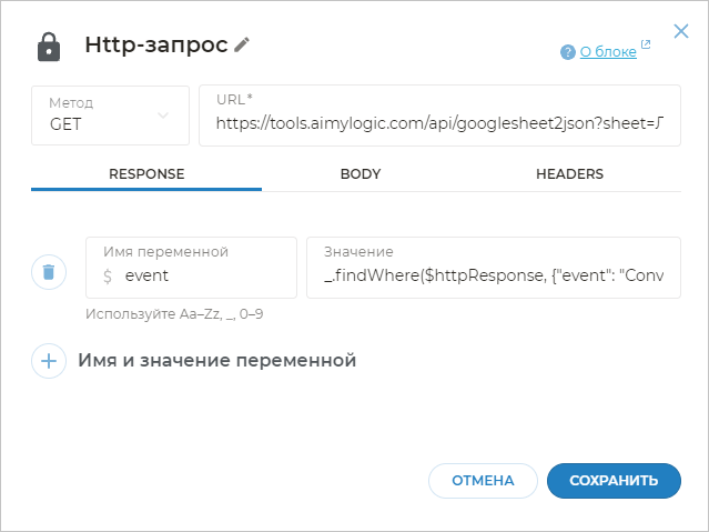 _.findWhere($httpResponse, {"event": "Conversations 2021"}) - Вкладки BODY и HEADERS оставьте пустыми.