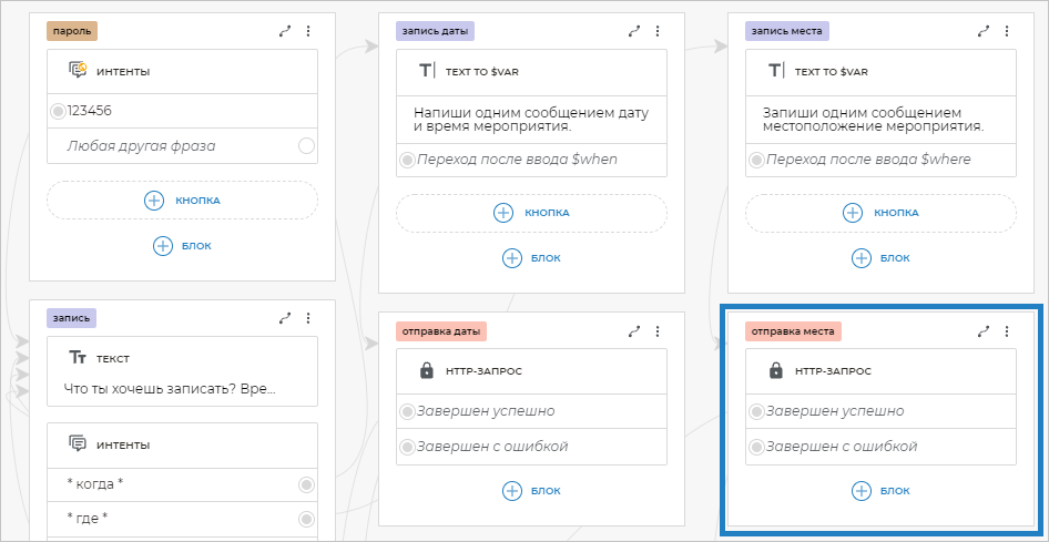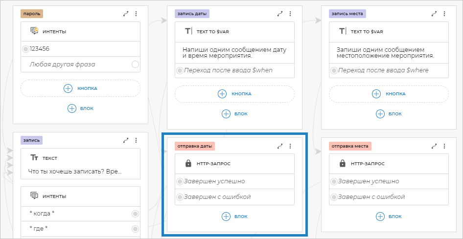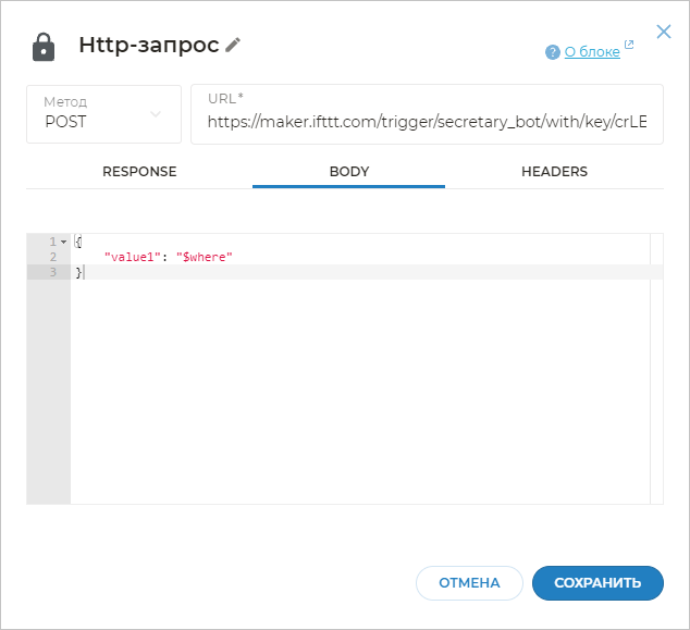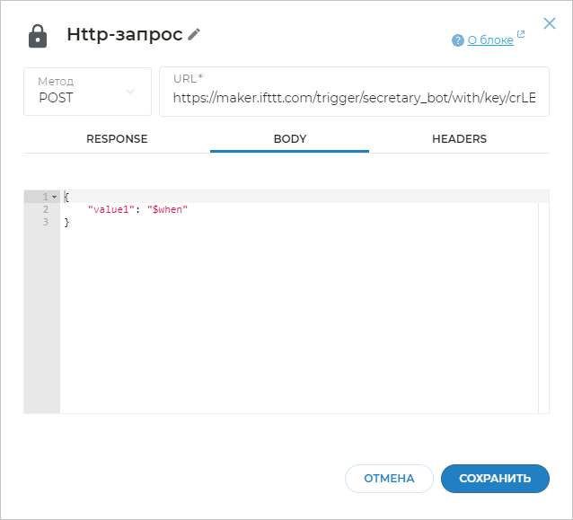 В сценарии бота откройте блок HTTP-запрос с экрана «отправка даты».