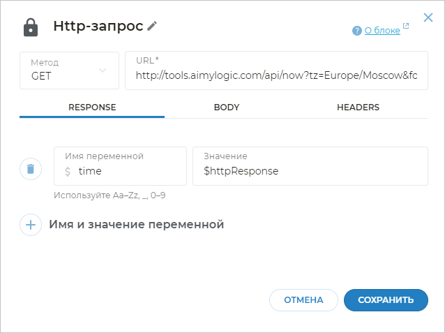 tz после знака =. Часовой пояс указывается в формате IANA TZDB. Например, чтобы получить дату и время в Токио, в URL укажите tz=Asia/Tokyo.Нажмите Имя и значение переменной. В качестве имени переменной укажите time, а в качестве значения — $httpResponse.