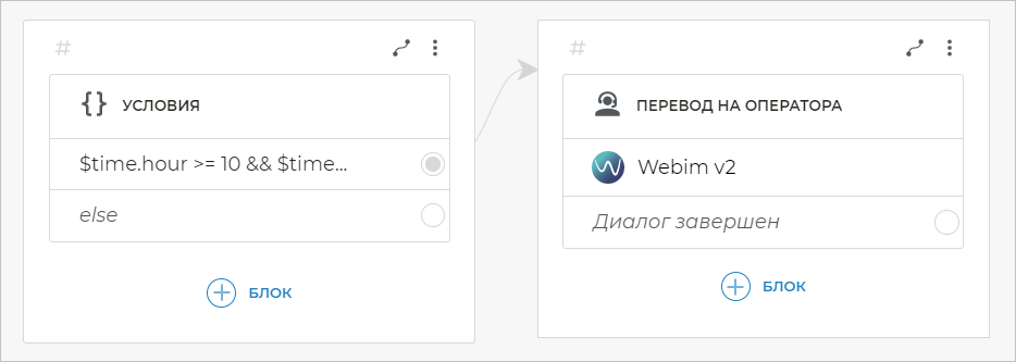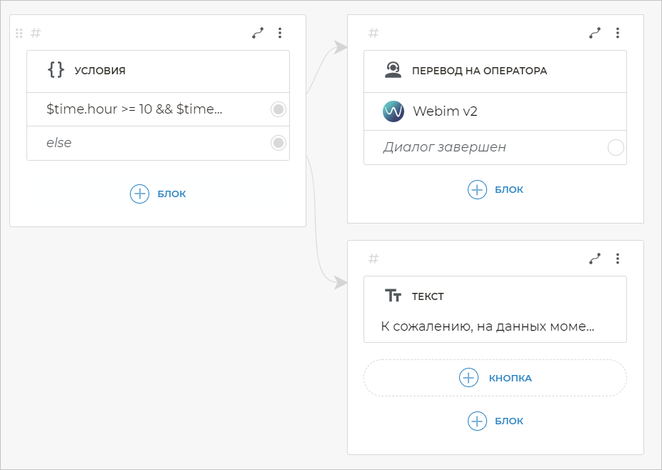 Если условие $time.hour >= 10 && $time.hour < 19 && $time.weekDay <= 5 верно, это означает, что сейчас рабочее время. Так как в этом примере мы хотим, чтобы в рабочее время с клиентами общались операторы, свяжите данное условие с блоком Перевод на оператора.