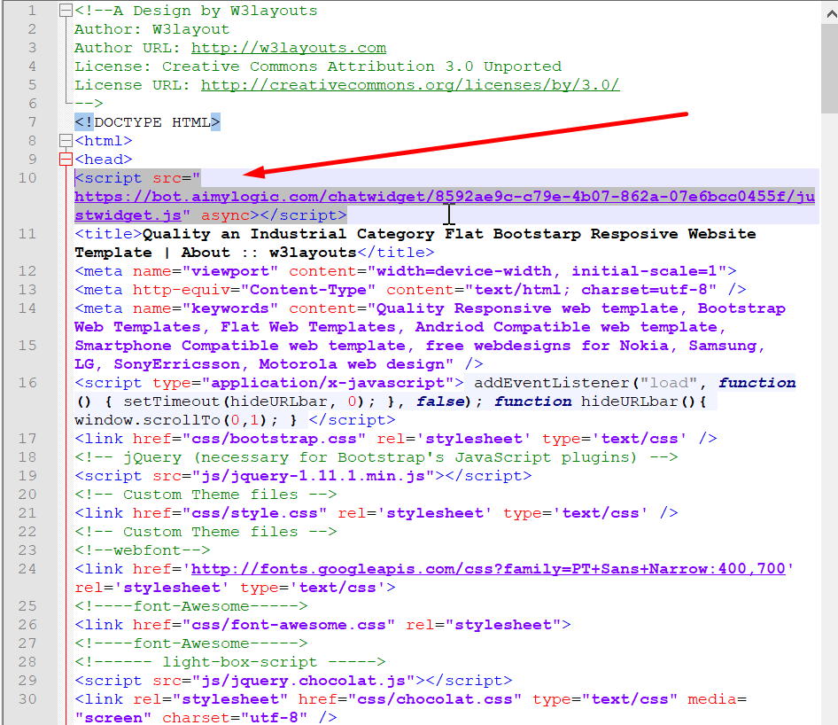 Теперь вам нужно вставить этот код между тегами <head> на всех страницах вашего сайта, где вы хотите разместить виджет с вашим ботом. Например, так: