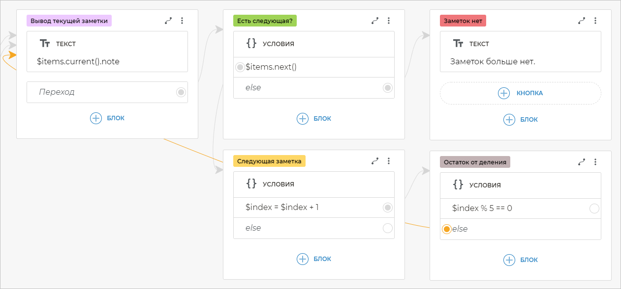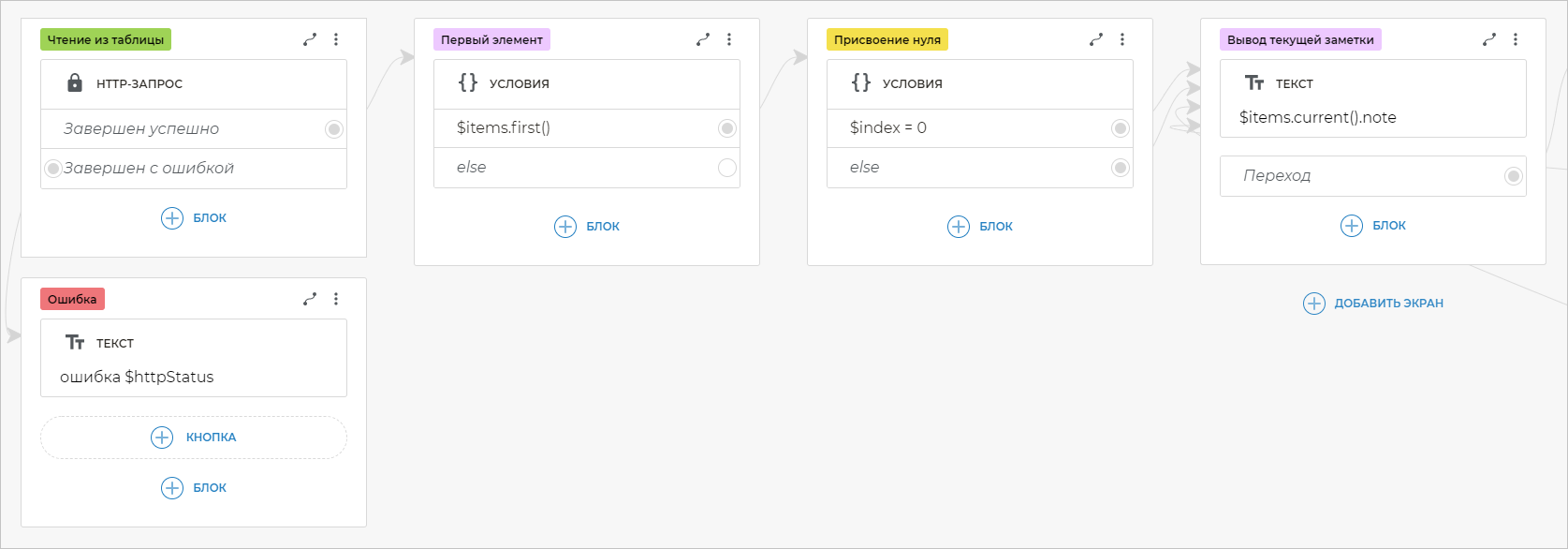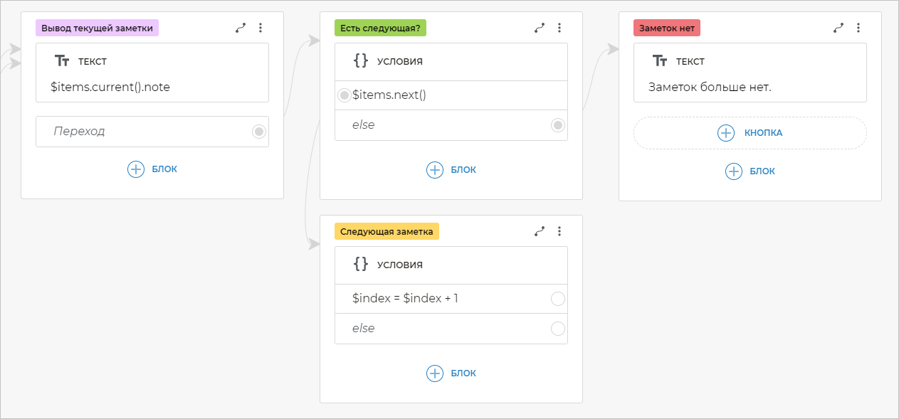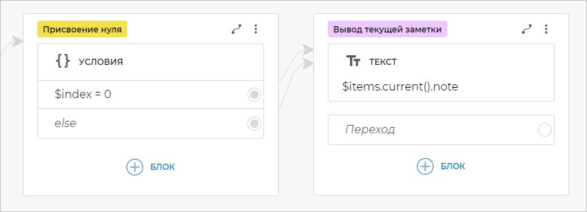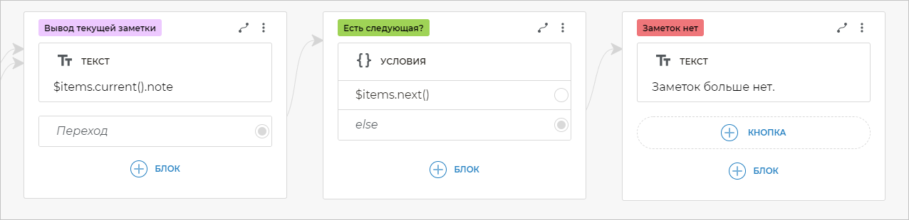 На следующем экране добавьте блок Текст и напишите в нем $items.current().note.