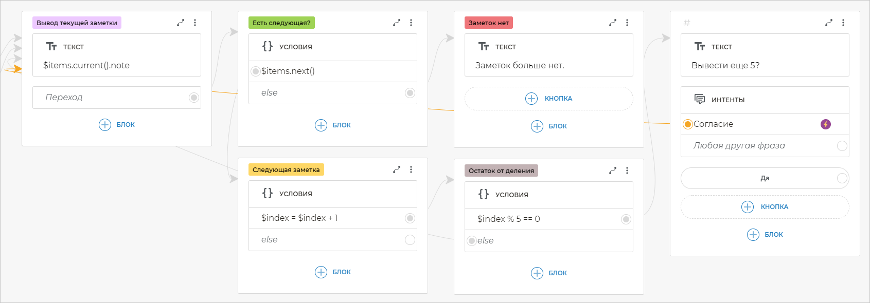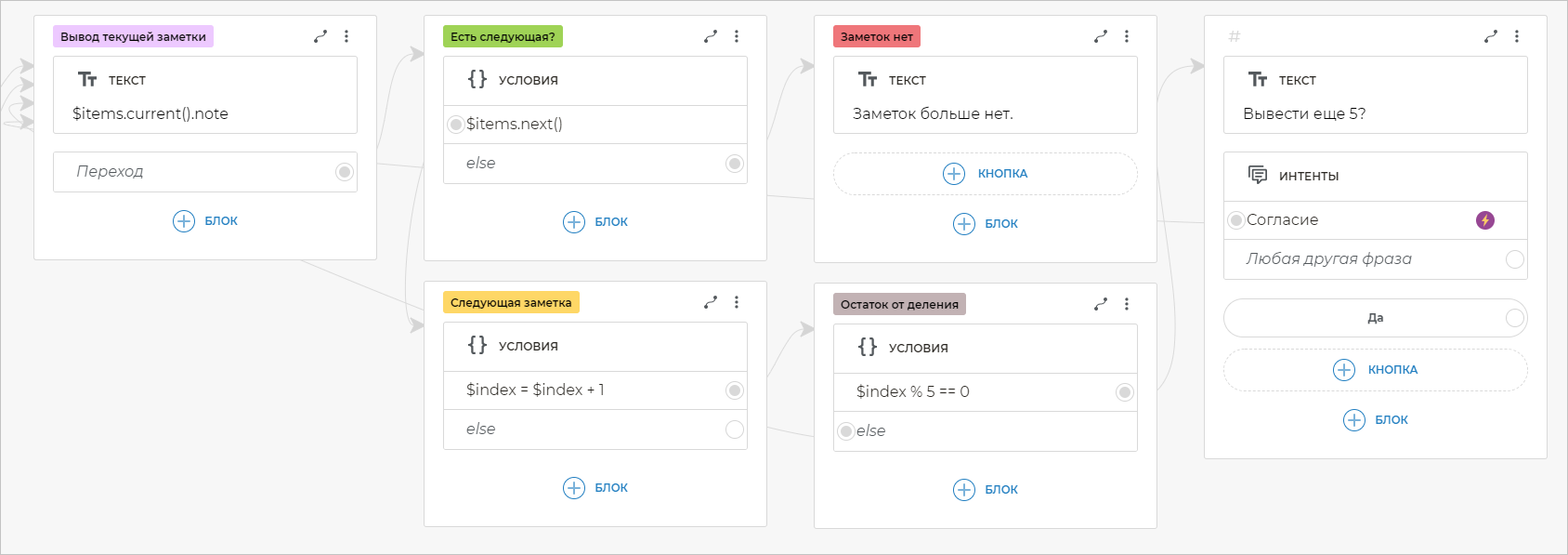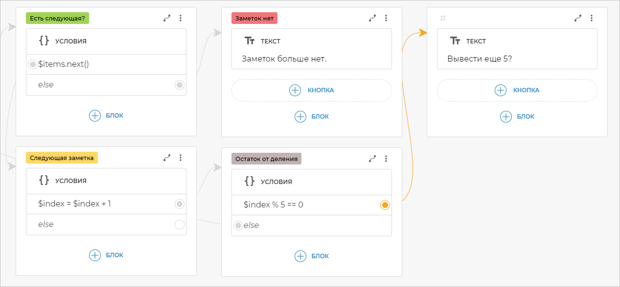 В этом сценарии бот выведет 5 элементов массива. После этого, если в массиве остались элементы, бот спросит, вывести ли еще 5 элементов. Если клиент ответит «да», то бот будет выводить элементы массива до тех пор, пока они не закончатся.