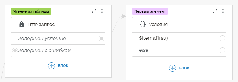 От варианта Завершен успешно сделайте связь с блоком Условия, в котором укажите выражение $items.first().