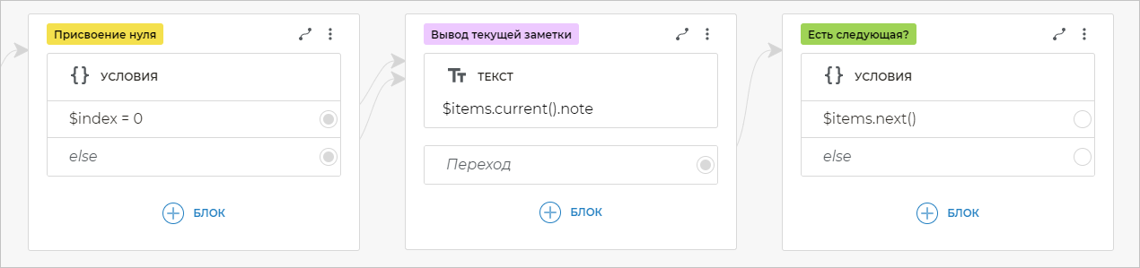 От блока Переход создайте блок Условия, в котором напишите $items.next().