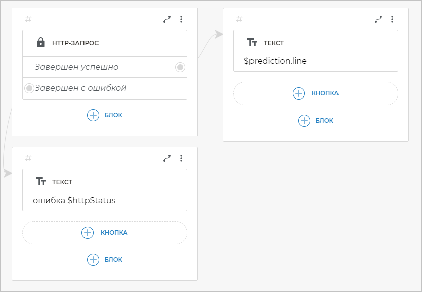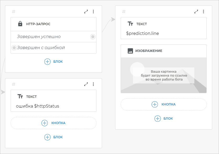 Бот будет выводить изображение, которое соответствует случайной строчке, полученной в HTTP-запросе. С помощью переменной $prediction.image мы указываем путь к изображению, а сами картинки хранятся в таблице и не занимают место в сценарии.