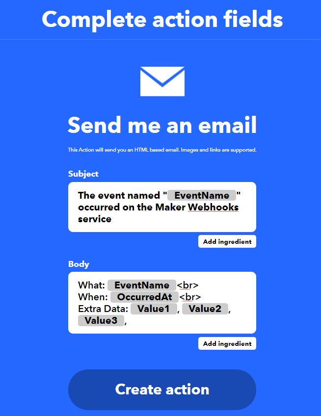 подсказкаIFTTT позволяет отправлять не более трех переменных в одном событии. Если вам нужно отправлять большее количество переменных, вы можете воспользоваться каким-либо платным аналогом сервиса IFTTT, например, Zapier.Вы можете отредактировать статичную часть письма, а также убрать параметры