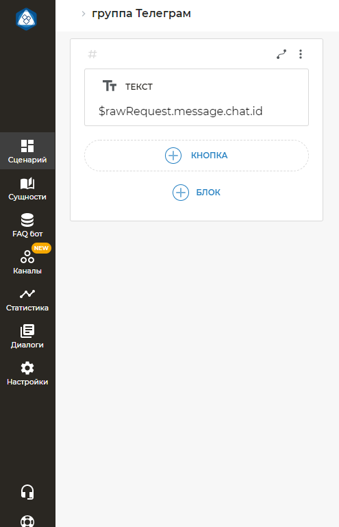 В первую очередь, в качестве стартового экрана добавьте в сценарий текстовый блок, в который скопируйте и вставьте: $rawRequest.message.chat.id
