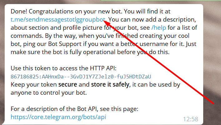 - Ссылка на бота есть в BotFather, в сообщении, в котором вы получали токен бота