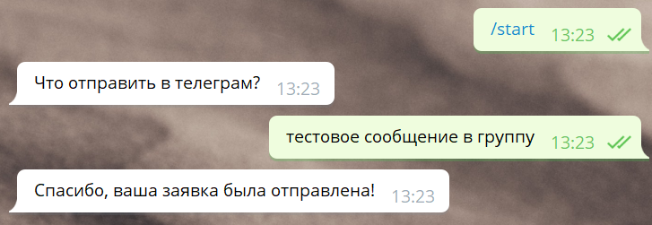 Запустите новую сессию с помощью /start, пришлите боту сообщение и убедитесь, что оно приходит в группу:
