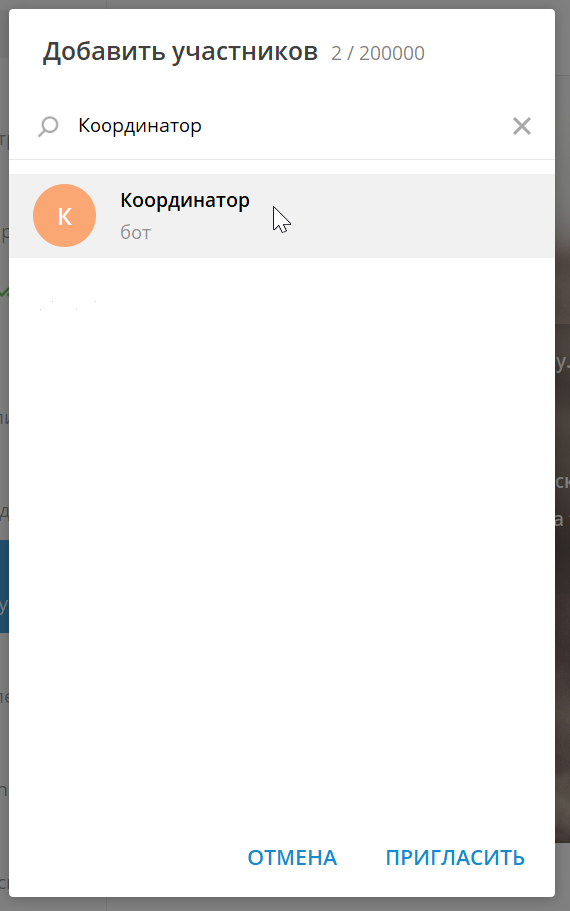 Добавьте в группу хотя бы одного участника и нажмите Создать, а затем добавьте в группу вашего бота. Для этого нажмите Добавить участников. Наберите название бота в поиске, выберите бота и нажмите Пригласить: