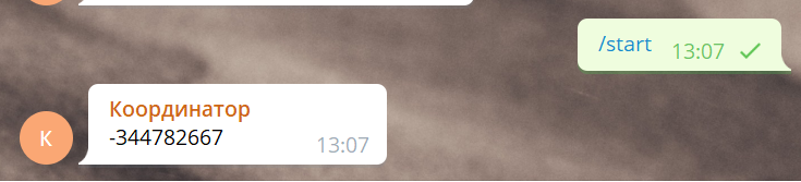 Отправьте в группу команду /start. Бот отправит вам сообщение из набора символов. Это значение, включая знак -, понадобится вам позже: