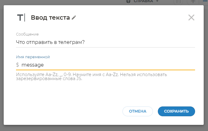 Например, добавим блок text to $var, с помощью которого будем записывать сообщение в переменную $message: