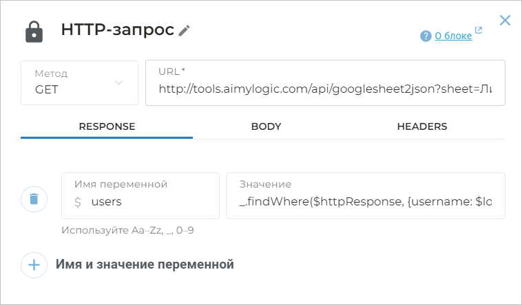На вкладке RESPONSE добавьте переменную $users со значением _.findWhere($httpResponse, {username: $login}).