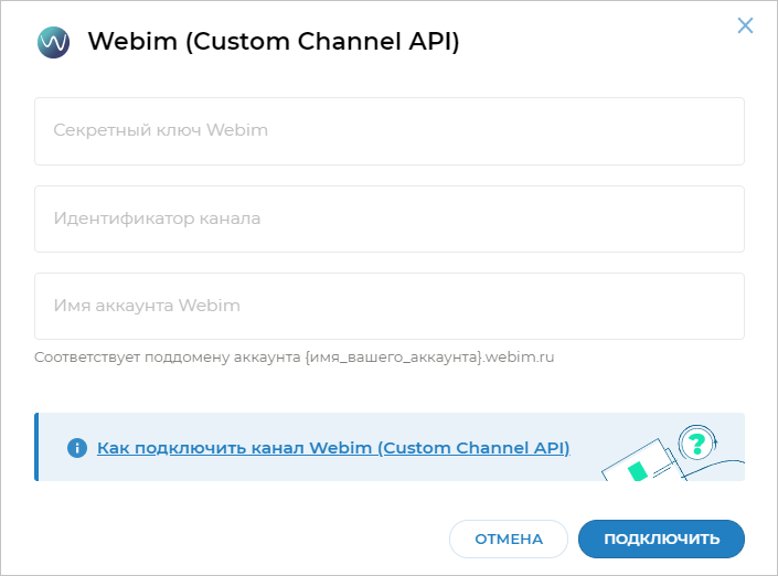 После того как вы нажмете Подключить, на странице появится интеграция с Webim (Custom Channel API).