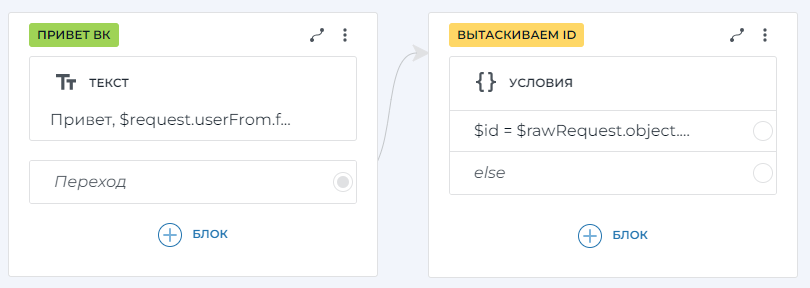 - На экран приветствия в вашем сценарии добавьте блок «Переход» и соедините его с блоком условий, с помощью которого будем получать ID пользователя: