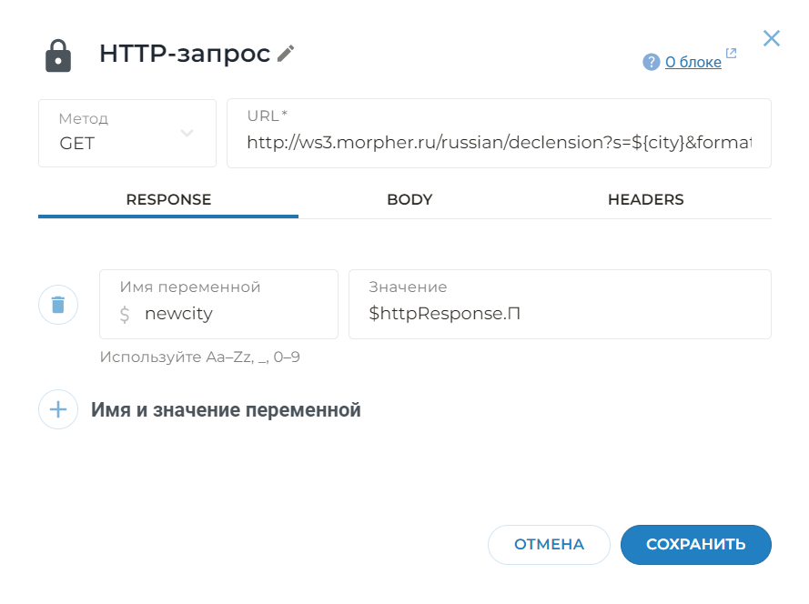 Здесь мы в фигурных скобках указали название переменной, содержание которой будем склонять. В нашем случае это переменная $city, но вы можете склонять значение любой другой переменной. Имя переменной: $newcity — запишем полученный от морфера массив в эту переменную Значение: $httpResponse.П