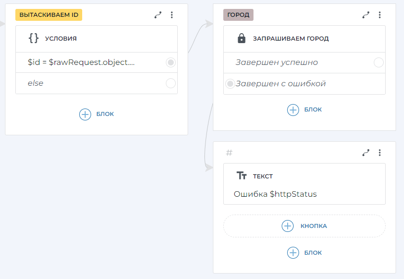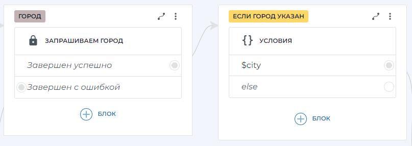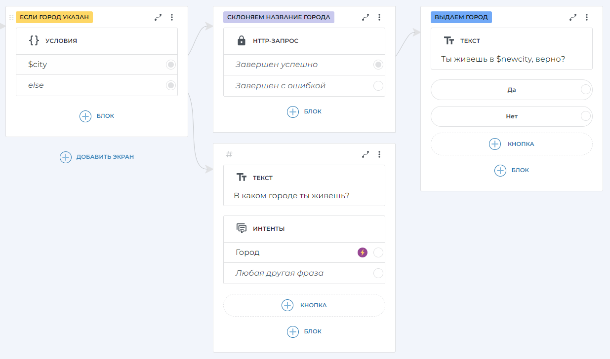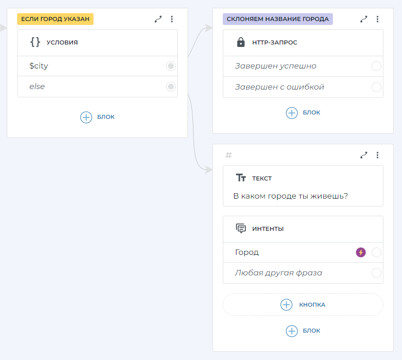 - Если это условие выполняется, можем продвигаться по сценарию (далее будем добавлять HTTP-запрос). А если нет (вариант else) добавим текстовый блок с вопросом о городе проживания.