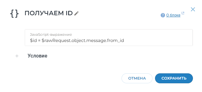 - Так как мы до этого получили ID пользователя с помощью блока условий, наш запрос содержит следующее значение:
