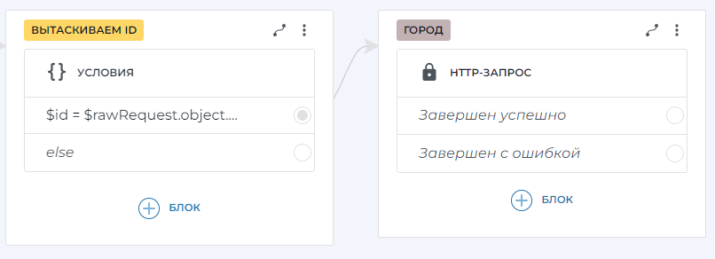 Далее, проверим, получили ли мы эту информацию — указан ли город у данного пользователя, и не закрыта ли эта информация настройками приватности. Свяжем вариант «Завершен успешно» HTTP-запроса с блоком условие, в котором пропишем: $city
